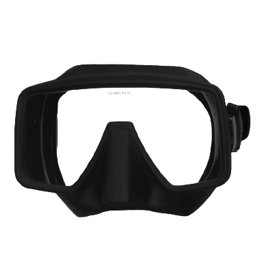 Frameless I is a super low volume single lens frameless design. ScubaMax made this mask with tempered safety glass lens, double edged silicone facial seal for snug airtight comfort, and a crystal silicone mask strap