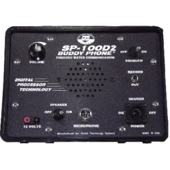 The SP-100D2 will operate with all single sideband acoustic underwater devices within range and on the same frequency. The user simply places the SP-100D2 Buddy Phone in a secure area, lowers the 35′ transducer cable in the water, turns the power on and talks via a hand-held microphone. All divers and/or other surface stations within range and the same frequency will receive the message. When any other persons within range and on the same frequency talks, the voice will be heard from the front panel speaker of the SP-100D2.